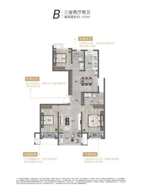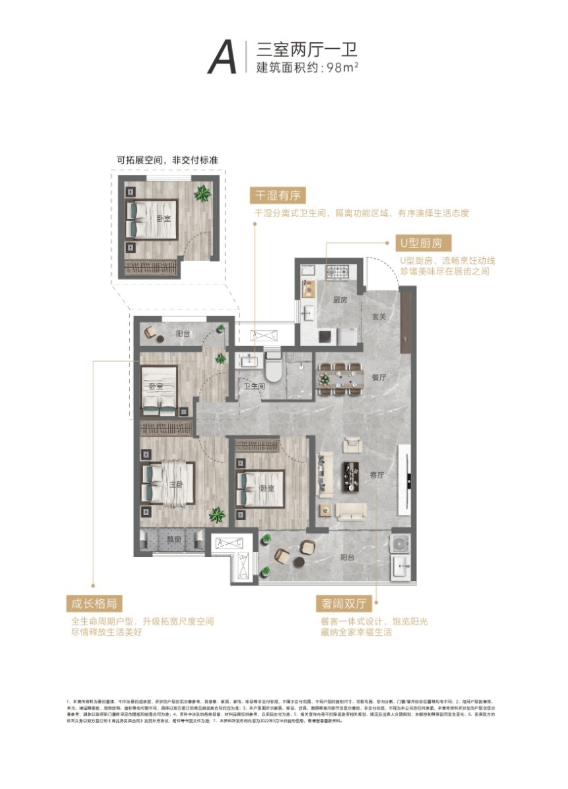 三居室户型定位 “成长型家庭改善首选”,建筑面积适中,空间布局开阔且灵活多变,完美适配三口之家到三代同堂的过渡。户型采用科学的动静分区设计,公共活动区域与私密休息区域严格分离,客厅、餐厅、厨房组成的公共区域开阔通透,南向全景阳台延伸空间视野,无论是家庭聚会、亲子游戏还是宴请亲友都绰绰有余;私密区域的三个卧室功能灵活,主卧套房设计,配备独立卫生间与衣帽间,保障主人居住的私密性与舒适度,随着家庭成长,衣帽间可改造为婴儿护理区,方便照顾新生儿;次卧空间宽敞,可作为儿童房,放置书桌、衣柜、儿童床,待孩子长大可改造成青少年房;第三个房间可根据家庭需求灵活改造,作为书房、客房,也可作为长辈房,满足三代同堂的居住需求。厨房采用 U 型布局,操作空间充足,储物能力强,可容纳多人同时操作,适合家庭聚餐时分工协作;公共卫生间干湿分离,配备优质卫浴洁具,避免早晚高峰使用拥堵。户型还特别设计了可拓展空间,如阳台可改造为阳光书房,入户花园可打造为储物间或休闲区,让空间随家庭需求不断优化。